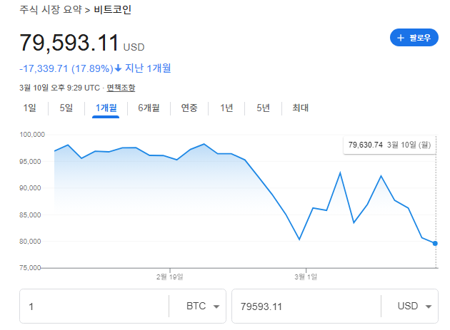 고점에서 100K USD를 넘어섰던 비트코인(BTC)은 현재 80K선이 붕괴되서 79,000달러 선에서 거래되고 있습니다.